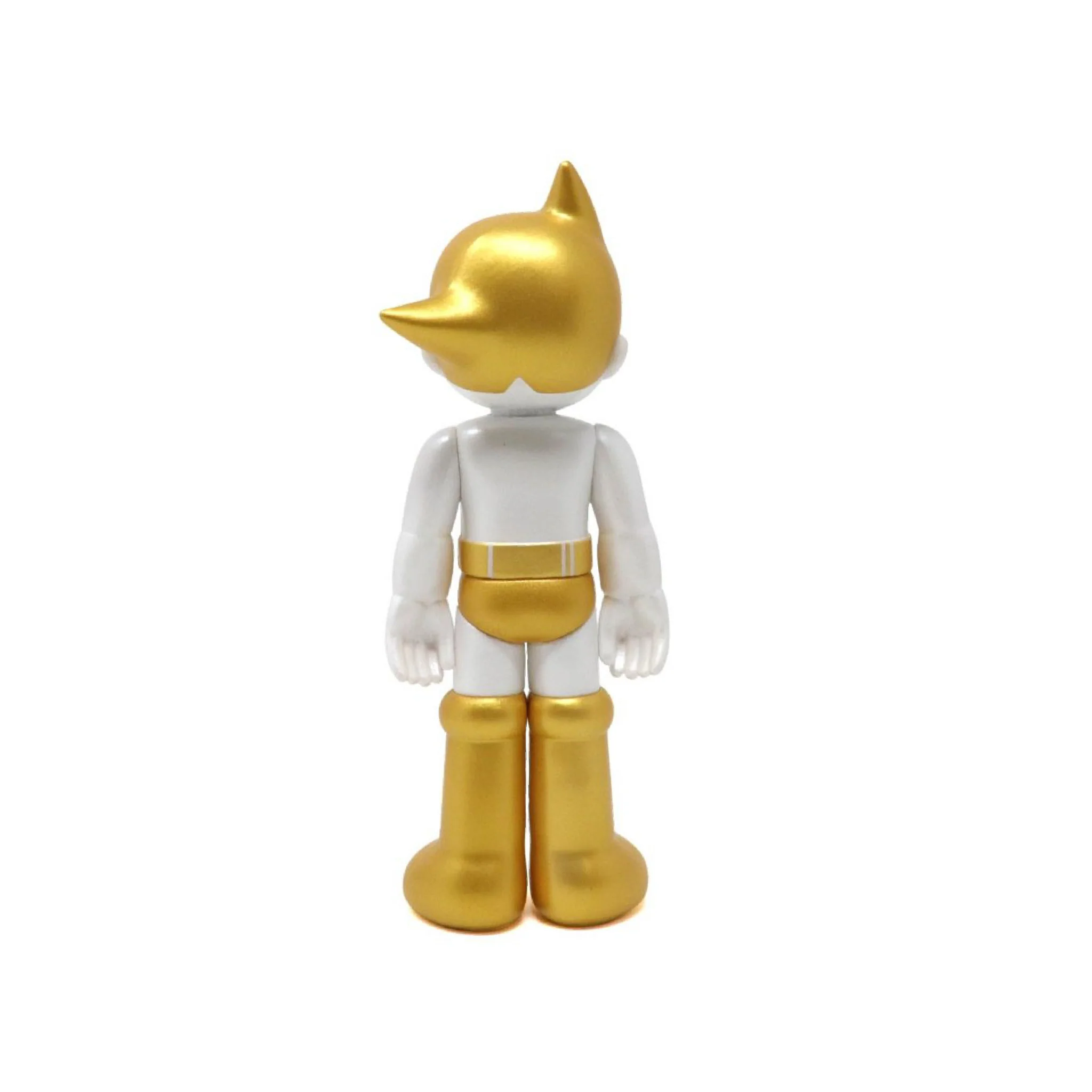 Classic Astro Boy figure stands approximately 5.35" tall. This is the Closed Eyes edition in a Gold and Silver colorway.