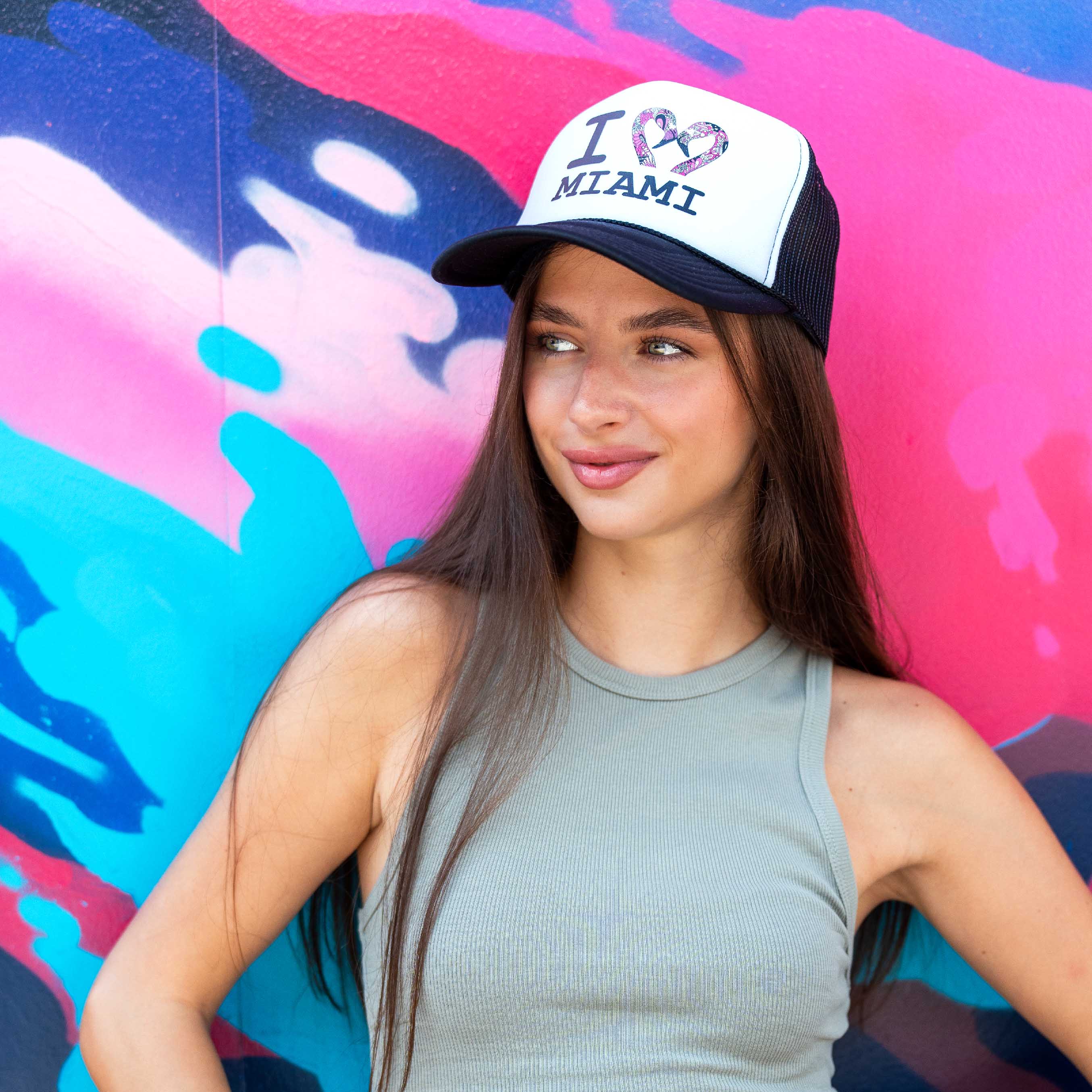 Urban Flair Meets Tropical Charm Embrace the fusion of urban streetwear and tropical aesthetics with the "I Love Miami Flamingos" trucker hat, designed by renowned artist Kelsey Montague. This hat isn't just a piece of apparel—it's a statement. Featuring bold flamingo artwork against a backdrop of vibrant Miami scenes, this accessory captures the essence of street art and tropical vibes. Perfect for urban explorers and art lovers alike, it offers a stylish way to shield yourself from the sun while flaunting a masterpiece.